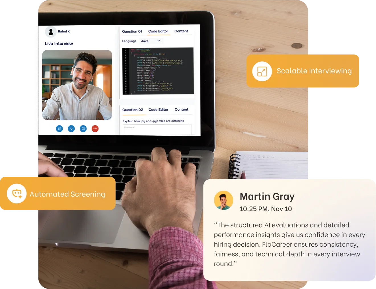 FloCareer is a human + AI interviewing platform that helps companies run structured, proctored interviews at scale across tech and non-tech roles, 24×7 and across time zones.