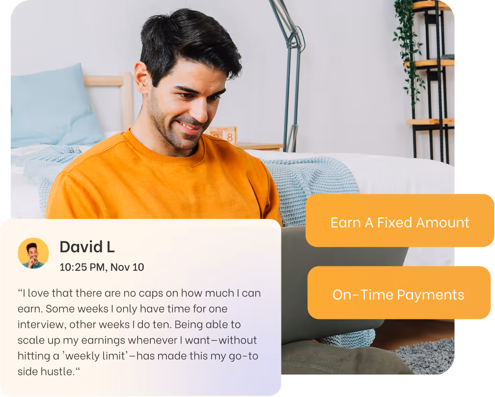 You earn per completed interview. Earnings vary based on your expertise, demand and number of interviews in your domain.